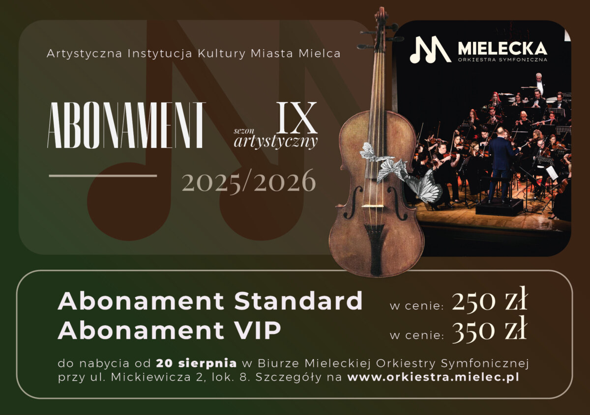 Zachęcamy do zakupu abonamentów na koncerty Mieleckiej Orkiestry Symfonicznej! To najlepszy sposób, by zapewnić sobie dostęp do wyjątkowych wydarzeń muzycznych przez cały sezon artystyczny na preferencyjnych warunkach.